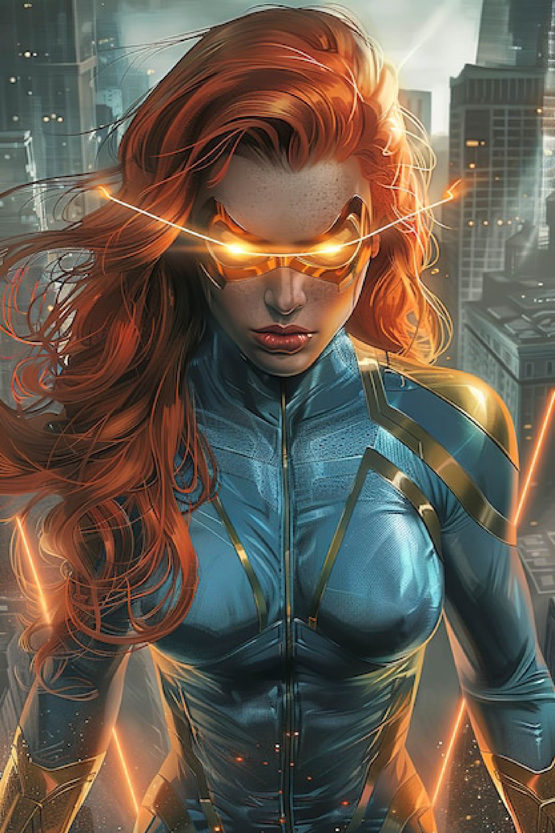 The artwork features a striking female character with flowing red hair, dressed in a sleek blue and gold suit that highlights her heroic presence. Her glowing visor and determined expression bring out an aura of unstoppable energy, while the vibrant orange sparks surrounding her add a sense of action and intensity. Measuring 6x9 inches, this piece makes a bold statement and is ideal for display in a personal collection or as a standout décor piece.