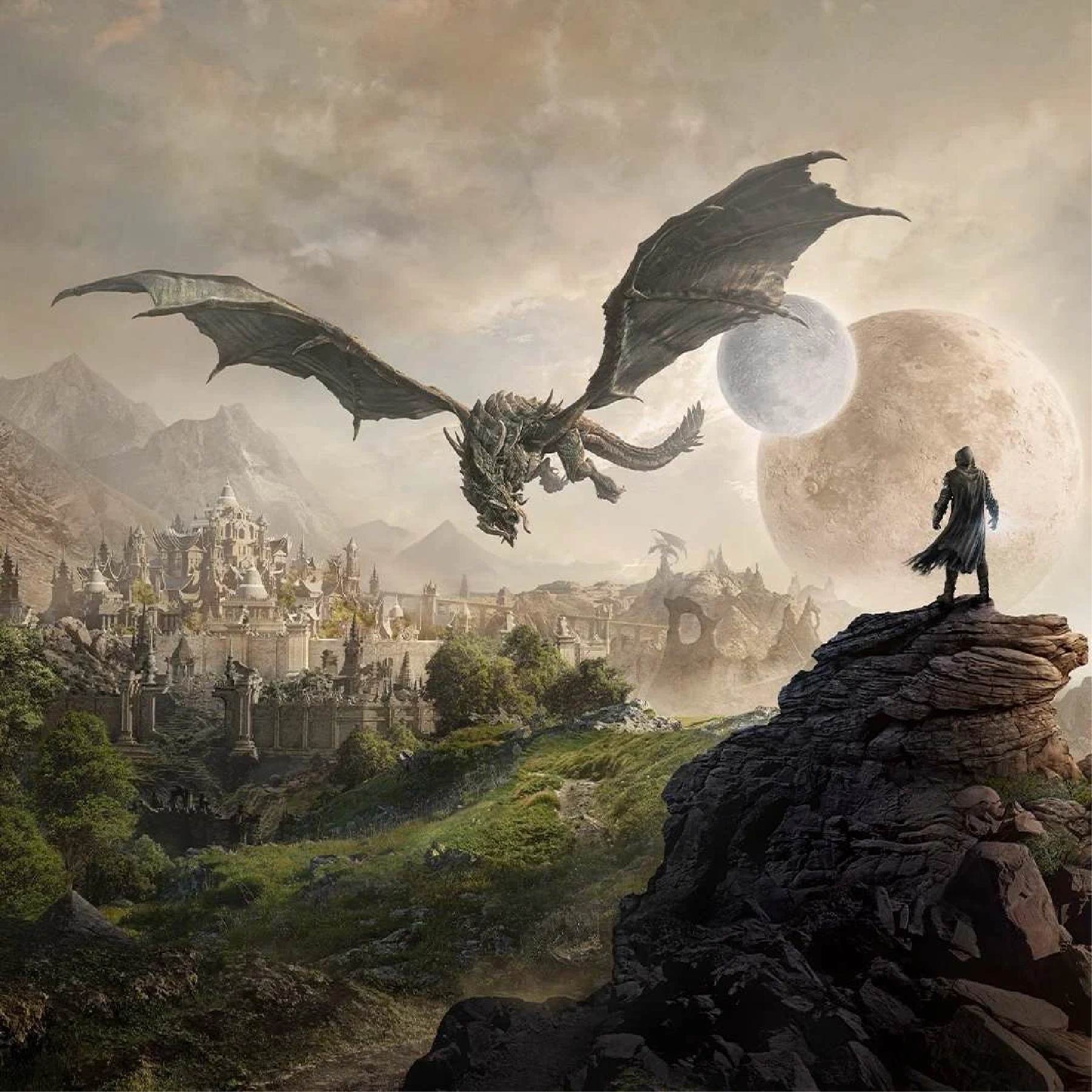 The artwork shows a fierce dragon soaring above a vast stone fortress as a lone cloaked warrior stands on a rocky cliff, ready to confront the beast. Two moons hang in the misty sky, adding a mystical tone to the dramatic standoff. With intricate details, muted earthy tones, and cinematic lighting, this 6x6 inch digital artwork is a striking piece for any gaming-themed collection.