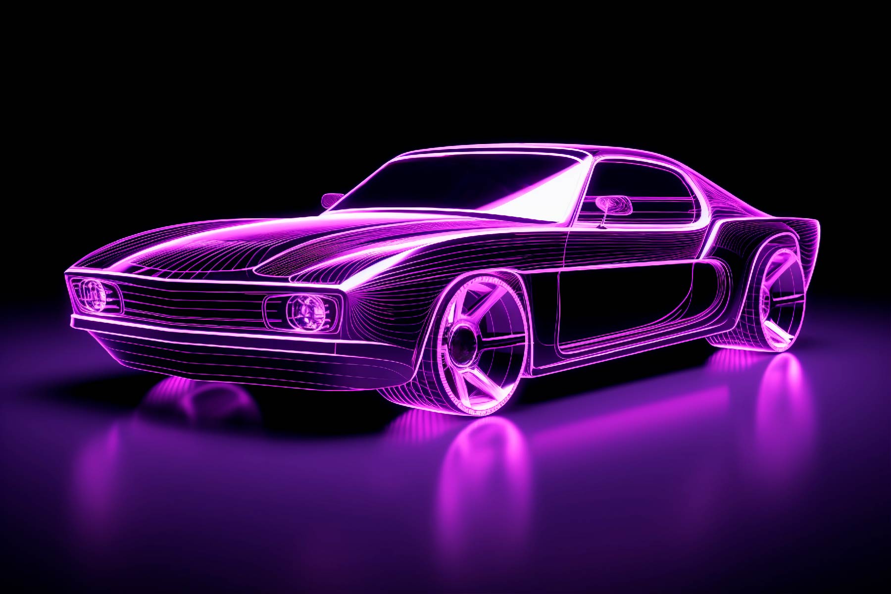 The piece features a sleek sports car illustrated with glowing neon purple lines, giving it a wireframe-like appearance against a dark background. Its luminous outlines and reflections create an immersive, almost holographic effect that makes the car look alive and dynamic. Printed at a size of 6x4 inches, this artwork offers both detail and vibrancy, making it ideal for display in modern interiors or as part of a themed collection.