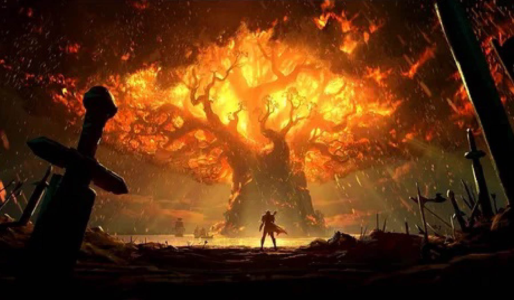- Subject: Burning ancient tree, lone warrior, battlefield with scattered swords