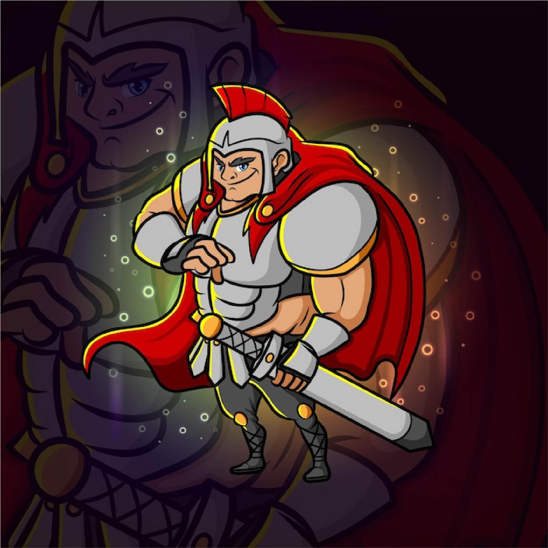 The artwork features a strong warrior dressed in shining armor with a red cape and helmet, holding a sword with confidence. His determined expression and glowing background details bring the character to life, symbolizing courage, strength, and readiness for battle. The bold colors, sharp outlines, and dynamic energy make it a striking and eye-catching piece of art.