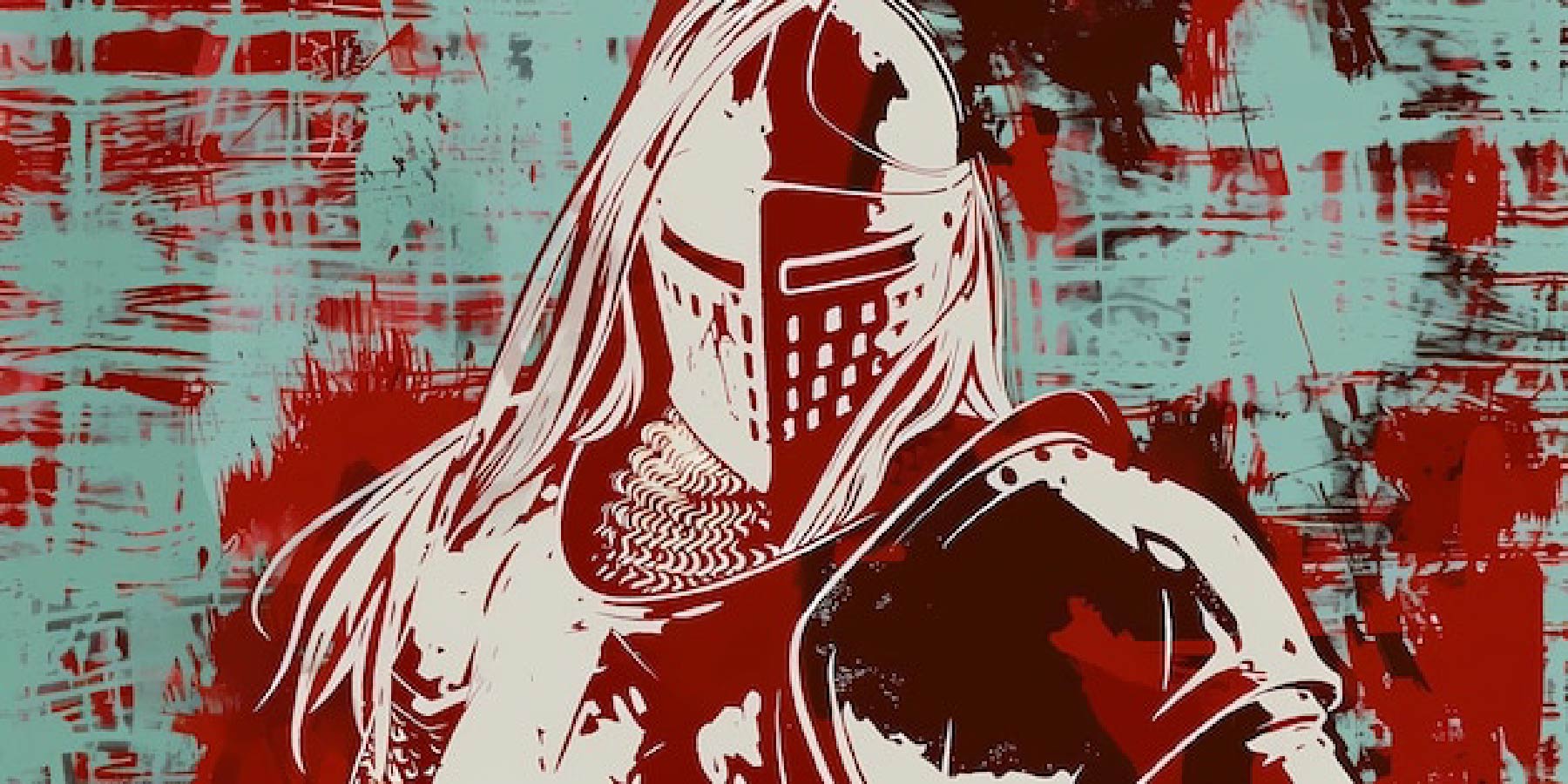 The piece depicts a knight in armor with long flowing hair, standing against a textured backdrop of red and teal tones. The contrast of sharp details in the helmet and chainmail with the abstract splashes of color creates a striking balance between strength and artistry.