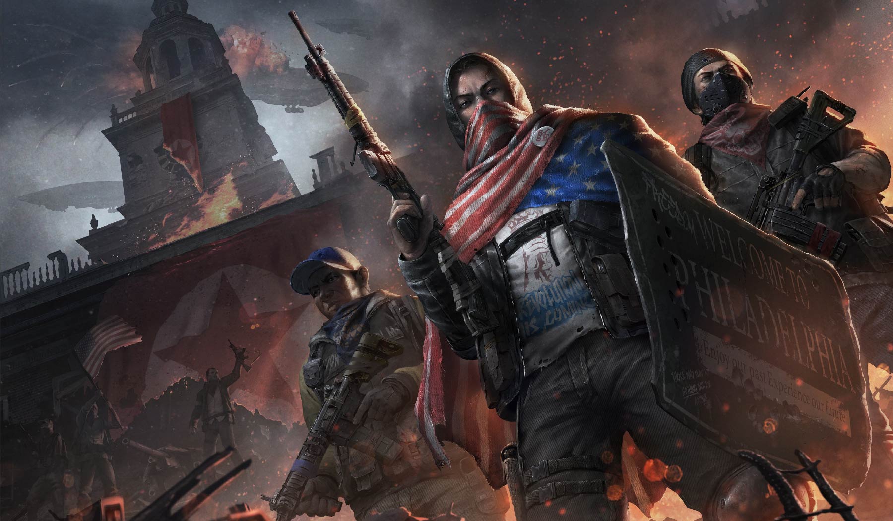 The artwork features armed freedom fighters standing strong against a backdrop of destruction, with the American flag draped as a symbol of defiance. Flames, smoke, and chaos surround them, yet the determination in their stance tells a story of courage and resistance. Every detail, from the weapons to the burning skies, reflects the struggle and energy of gaming worlds built on survival and revolution.